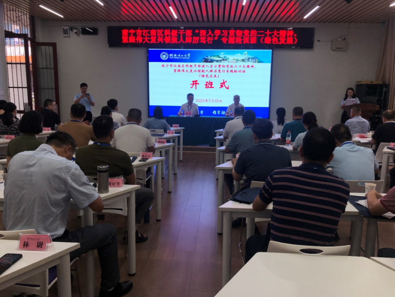 7月18日上午,南宁市江南区科级干部“深入学习贯彻党的二十大精神,紧跟伟大复兴领航人踔厉笃学”专题轮训班(绿色发展)在我校顺利开班。江南区人民政府副区长、党组成员蒋骎,学校2138CC太阳集团副院长张海林以及来自南宁市江南区的40余位学员参加了开班式。