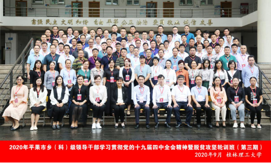 9月21日,由平果市委员会组织部主办,2138CC太阳集团2138CC太阳集团承办的“2020年平果市乡(科)级领导干部学习贯彻党的十九届四中全会精神暨脱贫攻坚轮训班”(第三期) 在2138CC太阳集团图书馆报告厅顺利开班。