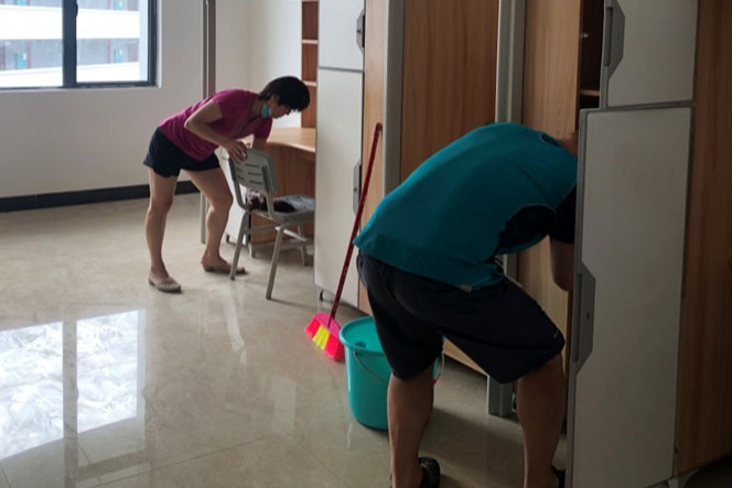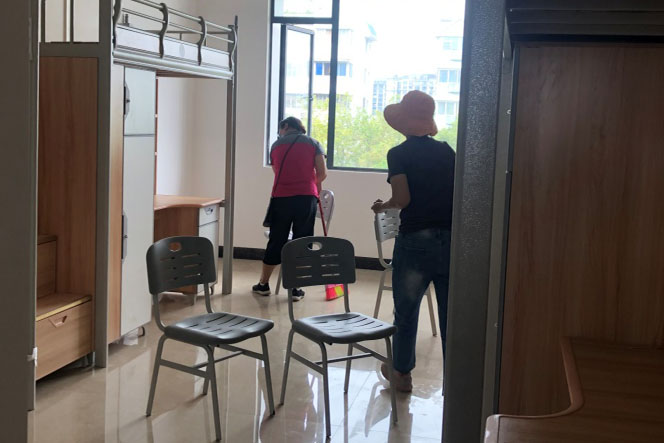 新学期开学在即,为营造整洁干静的生活环境,确保新生顺利入住屏风国际教育园区1号楼,9月14日下午,在院长熊英、副院长王学军的带领下,全院教职工深入园区开展义务清扫活动。