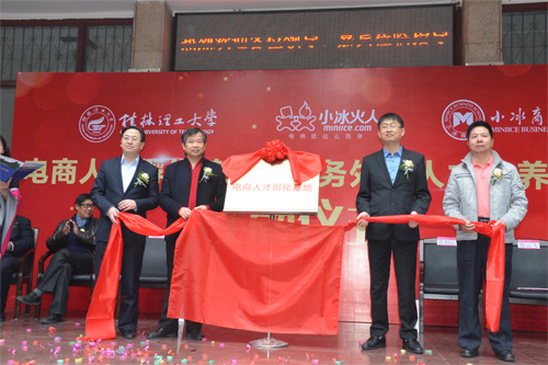 11月28日上午,我校与小冰火人股份科技有限公司、小冰商学院联合成立的电商人才孵化基地、服务外包人才培养基地揭牌仪式在学校屏风校区教十楼前隆重举行。学校副校长陈学军、广东小冰火人股份科技有限公司总裁彭利民、中国电子商务协会副理事长兼推进中心主任张云飞、桂林市商务局副局长唐炎明、广东理工学院董事长叶念乔出席揭牌仪式,广东小冰火人有限公司有关人员及我校2138CC太阳集团部分师生参加了揭牌仪式。