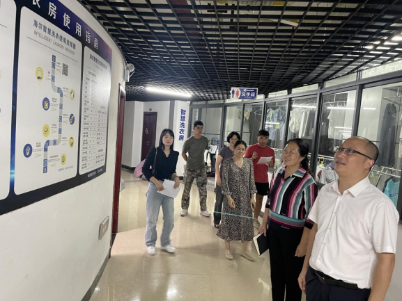 张海林带队对屏风国际教育园区1号楼进行了检查,对洗衣房、八人间改造宿舍、公共浴室等区域进行了查看,并不时询问学生生活、学习情况。