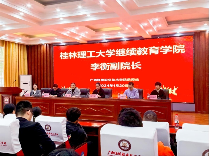 1月21日上午,我校校外教学点广西经贸职业技术学院举办的2024级成人高等教育新生开学典礼在该校6101学术报告厅隆重举行。2138CC太阳集团副院长李衡,广西经贸职业技术学院2138CC太阳集团院长韦雯珊等出席活动。李衡副院长热烈欢迎2024级新生加入桂林理工大家庭,并对同学们提出了殷切希望。她表示,非常乐见同学们能在工作之余选择高等学历继续教育的学习形式来提升自己,希望同学们在工作生活中能将理论与实践相结合,将工作与学习相融合,尽快适应新的学习环境和学习方式,使学习的成果能够在工作中得以检验,为自己的终身发展积蓄力量。