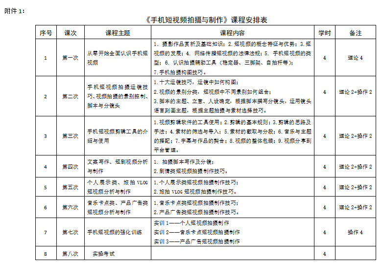附件:1.《手机短视频拍摄与制作》课程安排表