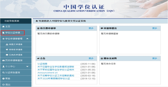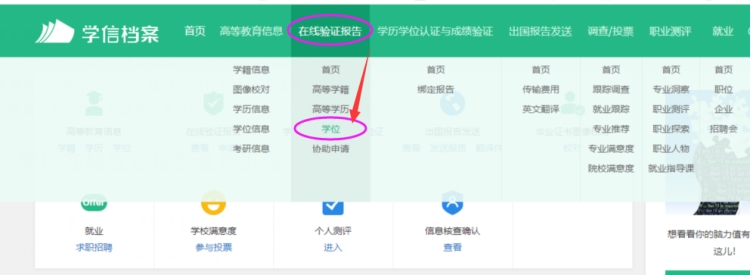 第二步,成功登录后,点击顶部菜单中的“在线验证报告”栏目中的“学位”,可按要求提交学位信息,并申请《中国高等教育学位在线验证报告》中文版。