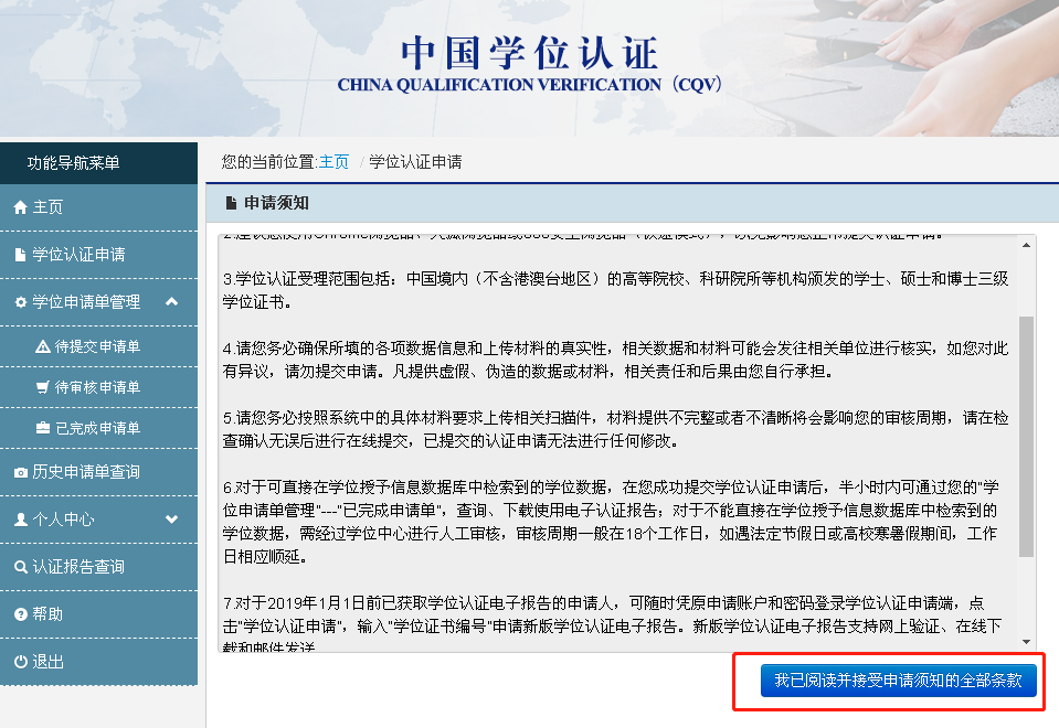 第四步、点击右下角“我已阅读并接受申请须知的全部条款”选项。