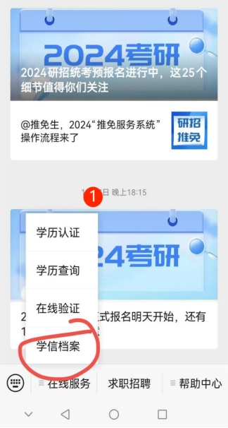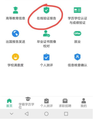 微信搜索中国高等教育学生信息网(简称学信网)并关注,在公众号底部【在线服务】里选择“学信档案”,使用学信网账号登录;选择“在线验证报告”,在顶部栏目中的“学位”,可按要求提交学位信息,并申请《中国高等教育学位在线验证报告》中文版。具体图文流程如下: