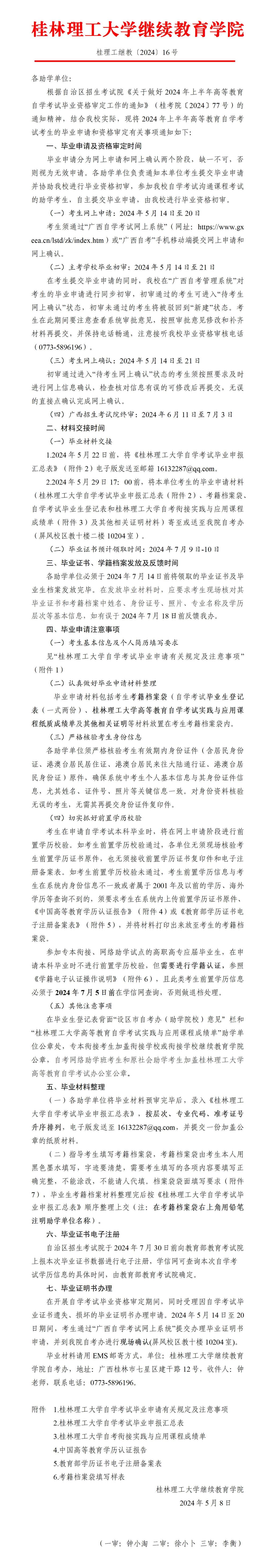 关于做好2024年上半年高等教育自学考试毕业资格审定工作的通知 发布者:自考办公室(考试中心) 2024-05-08 已阅人次 附件【附件1:2138CC太阳集团高等教育自学考试毕业申请有关规定及注意事项.docx】已下载次 附件【附件2:2138CC太阳集团自学考试毕业申报汇总表.docx】已下载次 附件【附件3:2138CC太阳集团高等教育自学考试实践与应用课程成绩单.docx】已下载次 附件【附件5:教育部学历证书电子注册备案表.docx】已下载次 附件【附件6:学籍电子认证操作说明.docx】已下载次 附件【附件4:中国高等教育学历认证报告.docx】已下载次 附件【附件7:考籍档案袋填写样表.docx】已下载次 上一条:关于做好2024年上半年高等教育自学考试专本衔接考生备案工作的通知 下一条:自治区招生考试院关于广西2022年10月高等教育自学考试报考的公告 关注我们