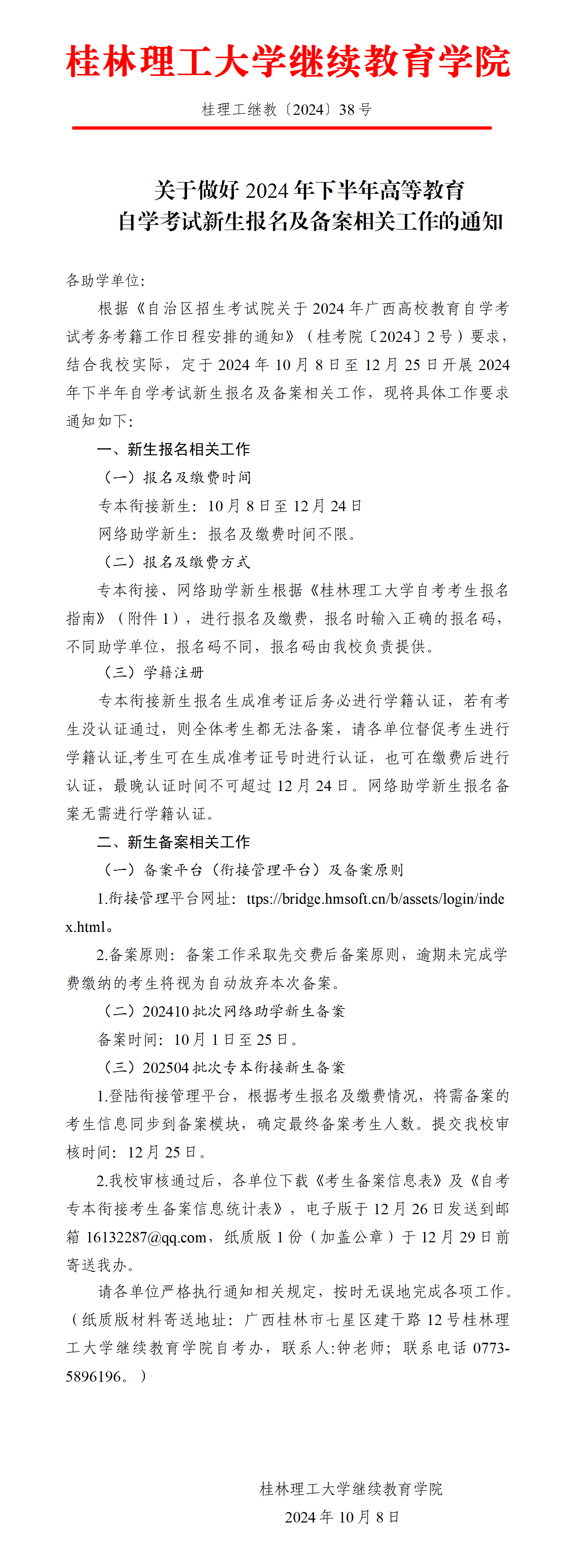 关于做好2024年下半年高等教育自学考试新生报名及备案相关工作的通知 发布者:自考办(考试中心) 2024-10-08 已阅人次 (一审:钟小淘 二审:徐小卜 三审:李衡) 附件【2138CC太阳集团自学考试考生报名指南(附件1).docx】已下载次 上一条:关于做好2024年下半年高等教育自学考试学士学位申报的通知 下一条:关于做好2024年秋季学期2138CC太阳集团高等教育自学考试有关工作的通知 关注我们