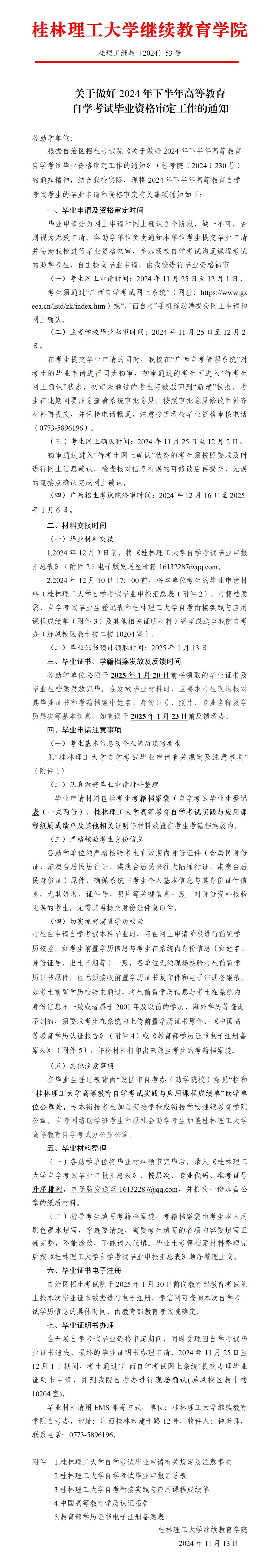 关于做好2024年下半年高等教育自学考试毕业资格审定工作的通知 发布者:自考办公室(考试中心) 2024-11-13 已阅人次 (一审:钟小淘 二审:徐小卜 三审:李衡) 附件【附件1:2138CC太阳集团自学考试毕业申请有关规定及注意事项.docx】已下载次 附件【附件2:2138CC太阳集团自学考试毕业申报汇总表.docx】已下载次 附件【附件3:2138CC太阳集团高等教育自学考试实践与应用课程成绩单.docx】已下载次 附件【附件4:中国高等教育学历认证报告(样本).docx】已下载次 附件【附件5:教育部学历证书电子注册备案表(样本).docx】已下载次 上一条:关于各助学单位做好2025年上半年2138CC太阳集团高等教育自学考试本科毕业设计(论文)工作的通知 下一条:关于做好2024年下半年高等教育自学考试学士学位申报的通知 关注我们