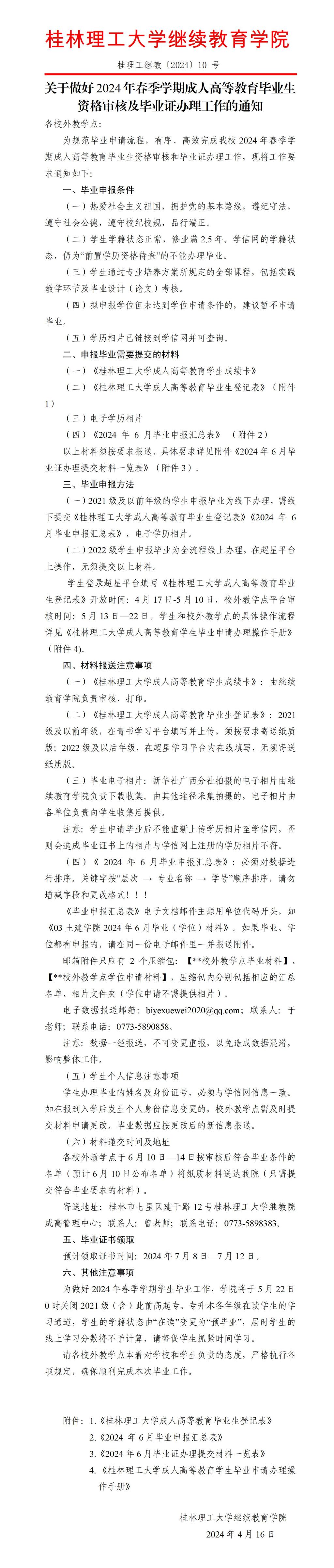关于做好2024年春季学期成人高等教育毕业生资格审核及毕业证办理工作的通知 发布者:成高管理中心 2024-04-16 已阅人次 (一审:于德新 二审:林文钊 三审:李衡) 上一条:关于做好2024年春季学期高等学历继续教育学士学位资格申报工作的通知 下一条:关于印发修订后的《2138CC太阳集团成人高等教育学生学籍管理规定》的通知 关注我们