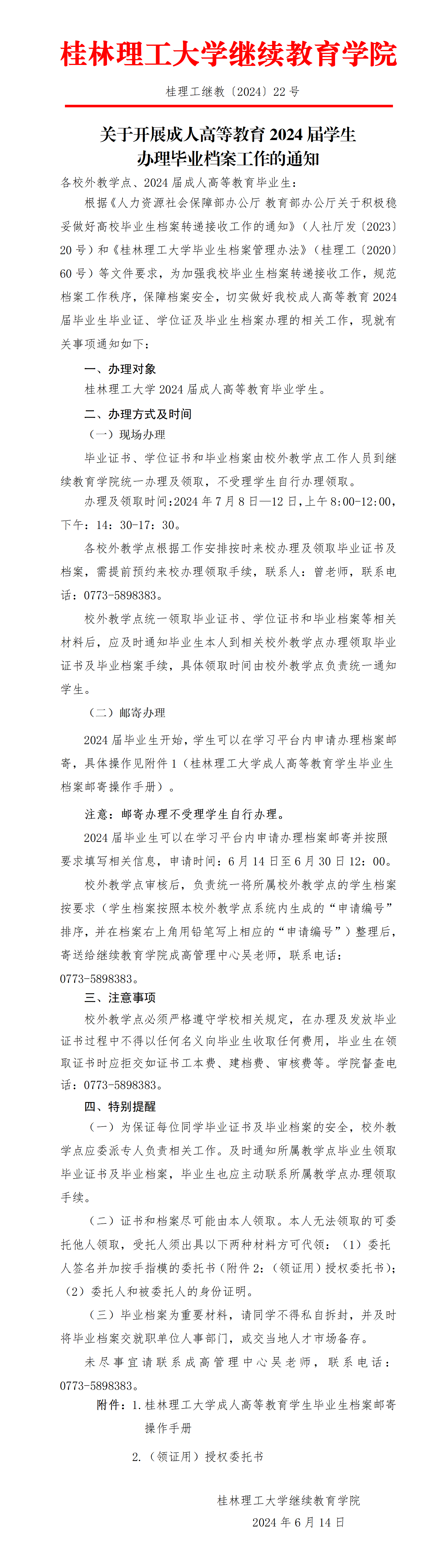 关于开展成人高等教育2024届学生办理毕业档案工作的通知 发布者:成高管理中心 2024-06-14 已阅人次 (一审:吴佳 二审:林文钊 三审:李衡) 上一条:关于做好2024年下半年我校高等学历继续教育本科学生毕业设计(论文)工作的通知 下一条:关于开展我校2024年春季学期成人高等教育学生线下面授学习的通知 关注我们
