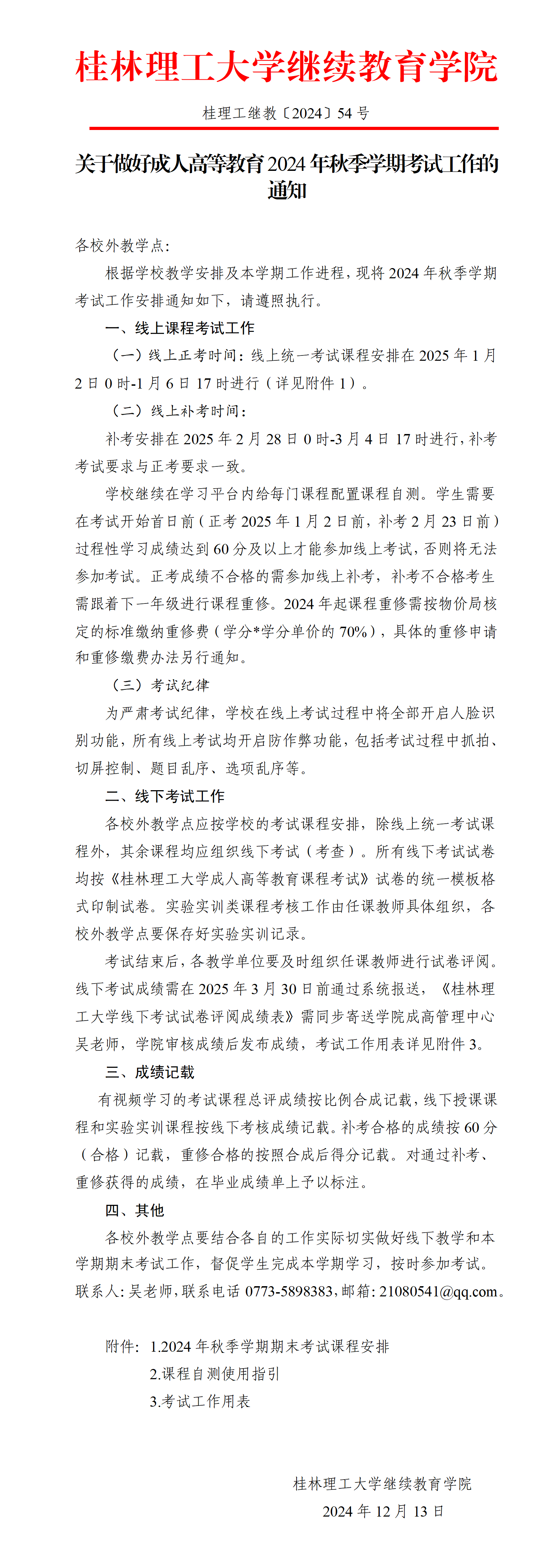 关于做好成人高等教育2024年秋季学期考试工作的通知 发布者:成高管理中心 2024-12-13 已阅人次 (一审:吴佳 二审:林文钊 三审:李衡) 上一条:2138CC太阳集团2025级成人高等教育新生入学须知 下一条:关于做好2024年秋季学期第二批线下面授学习的通知 关注我们