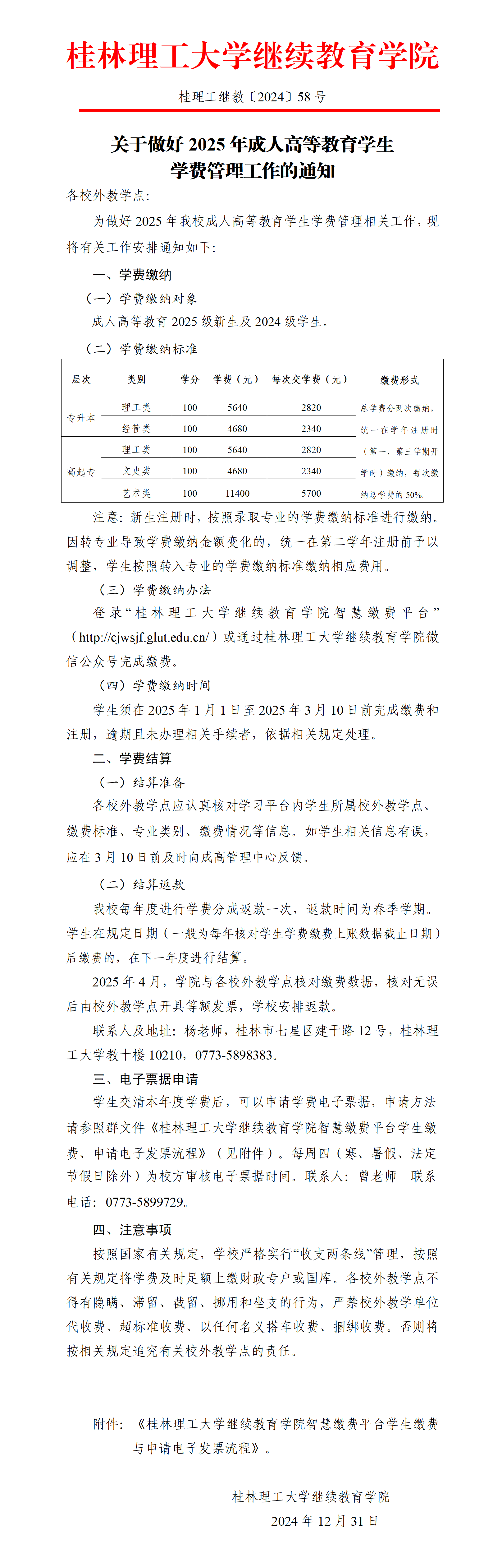 关于做好2025年成人高等教育学生学费管理工作的通知 发布者:成高管理中心 2024-12-31 已阅人次 (一审:杨燕芳 二审:林文钊 三审:李衡) 上一条:关于公布修订后的《2138CC太阳集团高等学历继续教育本科毕业设计(论文)撰写规范》的通知 下一条:2138CC太阳集团2025级成人高等教育新生入学须知 关注我们