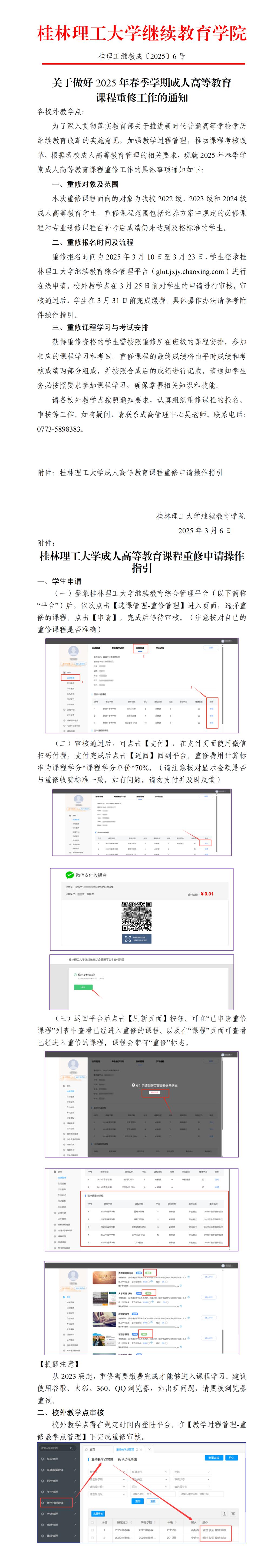 关于做好2025年春季学期成人高等教育课程重修工作的通知 发布者:成高管理中心 2025-03-06 已阅人次 (一审:吴佳 二审:林文钊 三审:李衡) 上一条:关于对徐晓秋等成人高等教育2025级新生按放弃入学资格处理的公示 下一条:关于做好2025年春季学期成人高等教育有关工作的通知 关注我们
