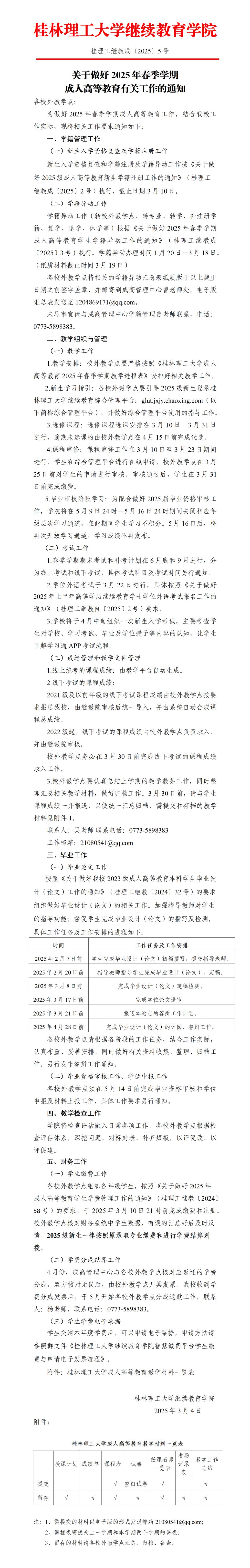 关于做好2025年春季学期成人高等教育有关工作的通知 发布者:成高管理中心 2025-03-04 已阅人次 (一审:吴佳 二审:林文钊 三审:李衡) 上一条:关于做好2025年春季学期成人高等教育课程重修工作的通知 下一条:2138CC太阳集团2025年高等学历继续教育校外教学点遴选结果的公示 关注我们